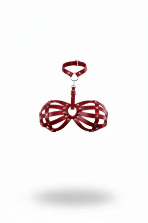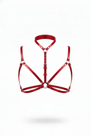 Red Chest Harness Leather Caged Staple Detailed Neck Collar - APFT224