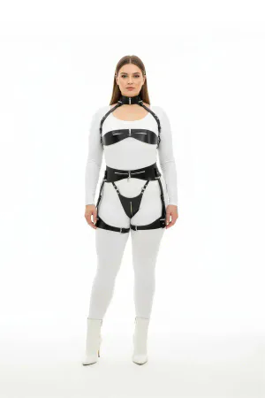 Plus Size Black Women's Leather Harness Set with Garter Detail - APFT1130