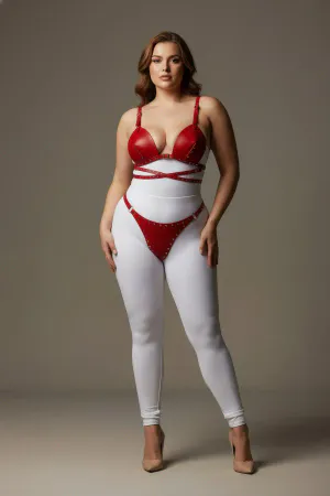 Plus Size Red Women's Harness Suit with Sexy Leather Staple Detail - APFT849