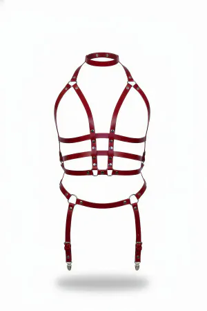 Claret Red Harness Suit with Neck Collar and Garter Leather Body Accessory - APFT707
