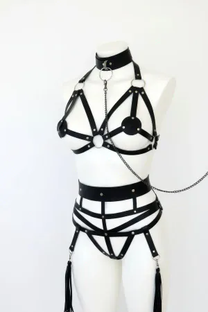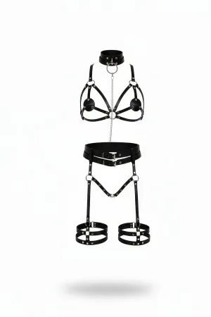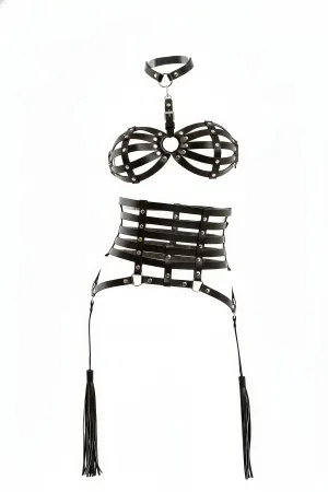 Black Harness Suit Leather Caged Staple Detailed Corset Set - APFT378