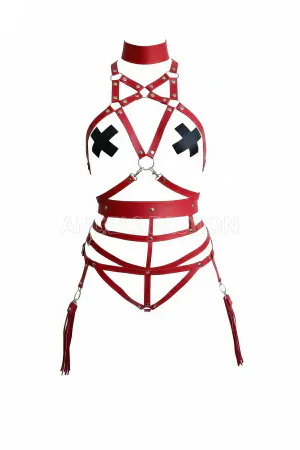 Red Harness Suit Chain Detailed Leather Body Belt Set - APFT457