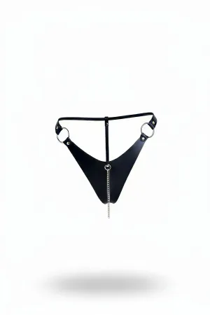 Black Thong - Panties Leather with Metal Ring Chain - APFT1275