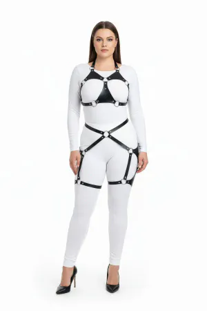 Plus Size Black Women's Full Body Leather Harness Suit with Garter Detail Special Design - APFT1231