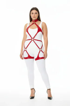 Plus Size Red Women's Leather Harness Suit Chain Detailed Fancy Accessory - APFT1350