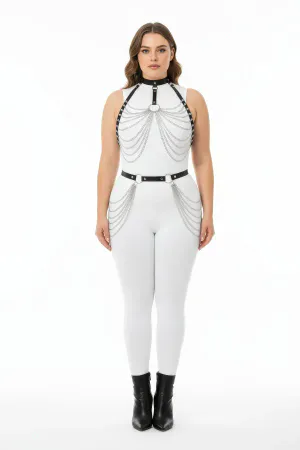 Plus Size Black Women's Harness Suit Chain Detailed Full Body Leather Accessory - APFT698