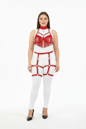 Plus Size Red Women's Leather Harness Suit with Tassel Detail and Garter - APFT715