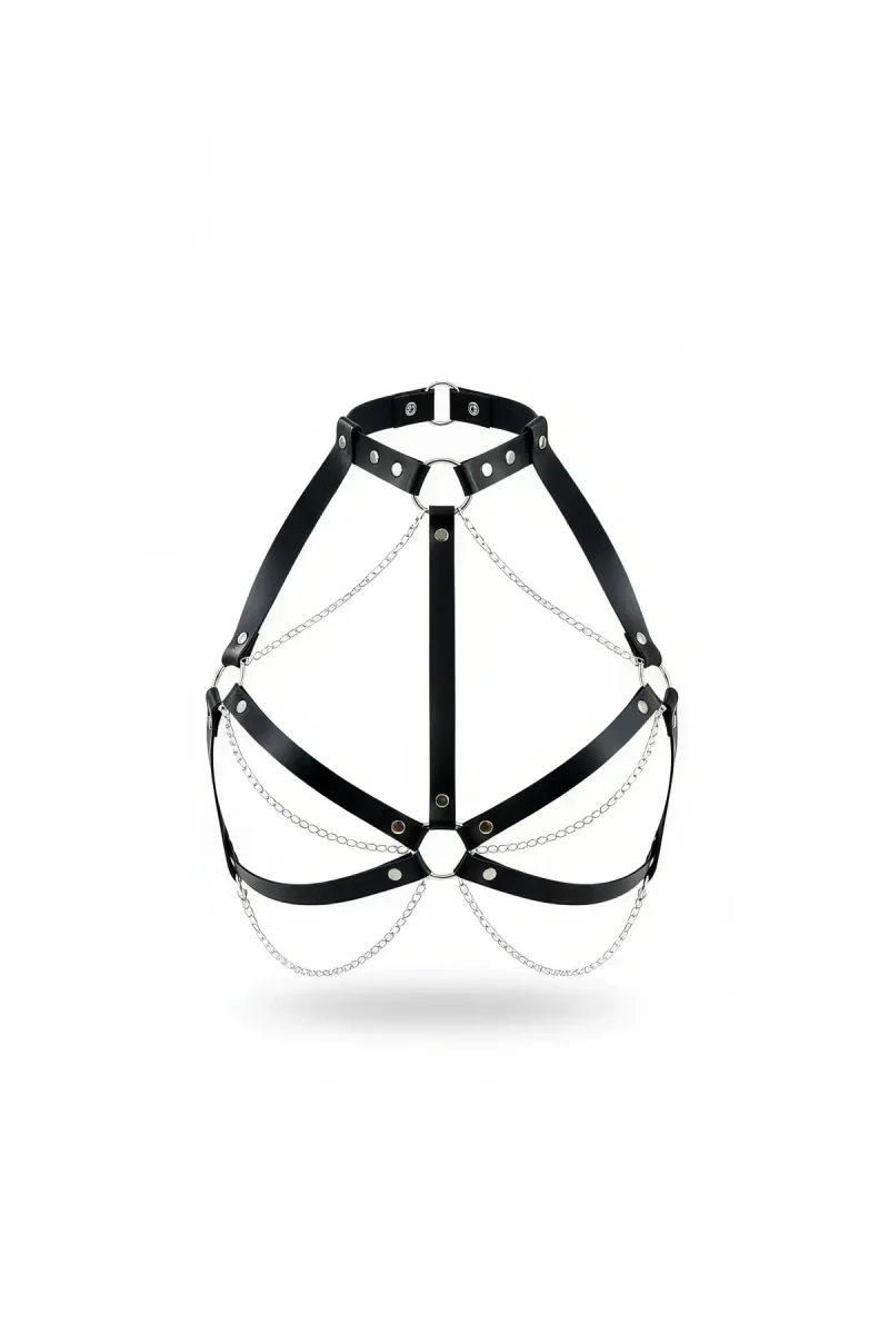 Home/Womens Harness/Chest Harness/Black Chest Harness Leather Chain Detailed Body Accessory - APFT796