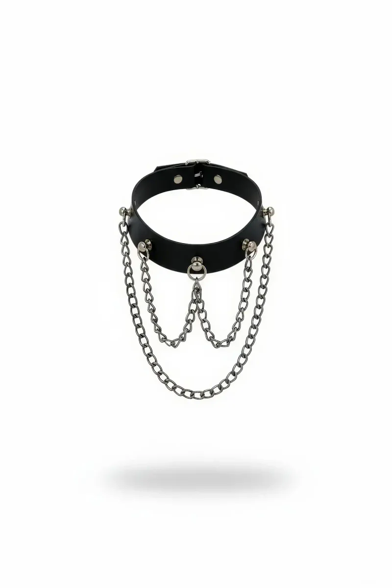 Black Choker Leather Chain Detailed Collar Necklace - APFT1071