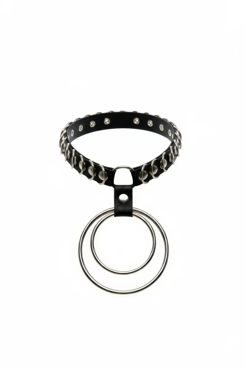 Black Choker Studded Double Ring Rubber Necklace - APFT576