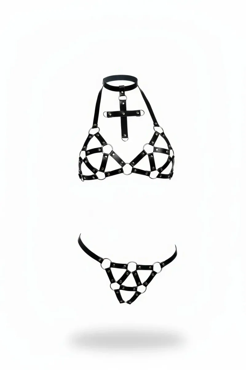 Black Harness Set Leather with Cross Detail and Rings - APFT464