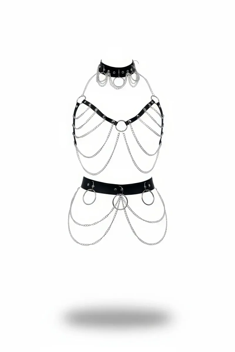 Black Harness Suit Leather Chain Detailed Body Accessory - APFT454
