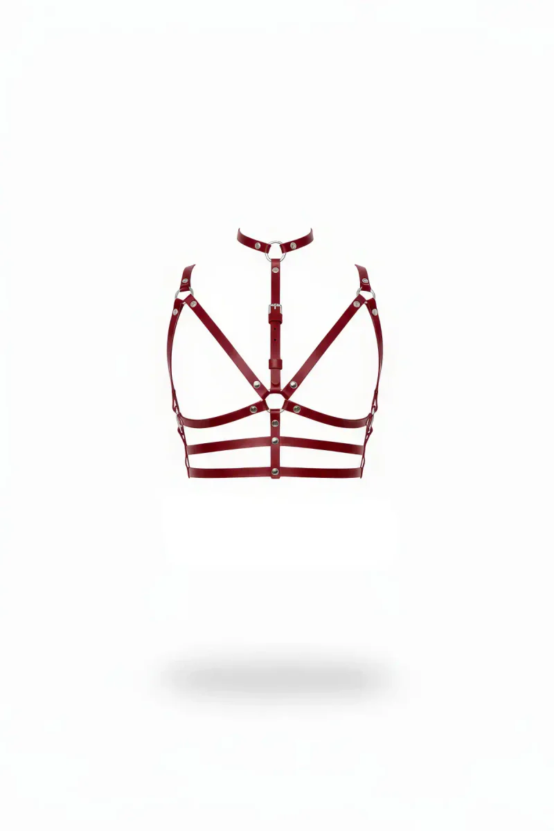 Home/Womens Harness/Chest Harness/Claret Red Chest Harness Leather Multi-Striped Ring Detailed - APFT235