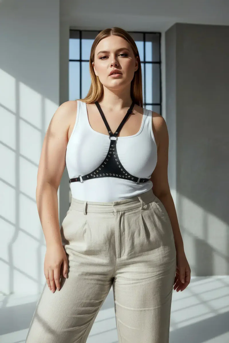 Plus Size Black Women's Belt Studded Leather Body Harness Accessory - APFT850