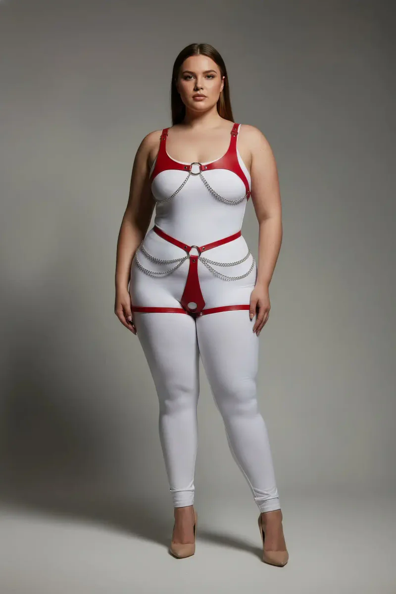 Plus Size Red Women's Leather Harness Suit Chain Detailed Body Accessory - APFT1384