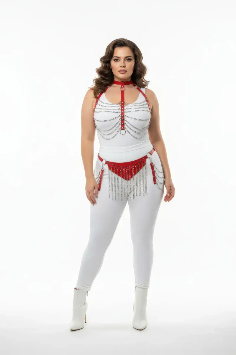 Plus Size Red Women's Leather Harness Suit Chain Detailed Fancy Accessory - APFT328