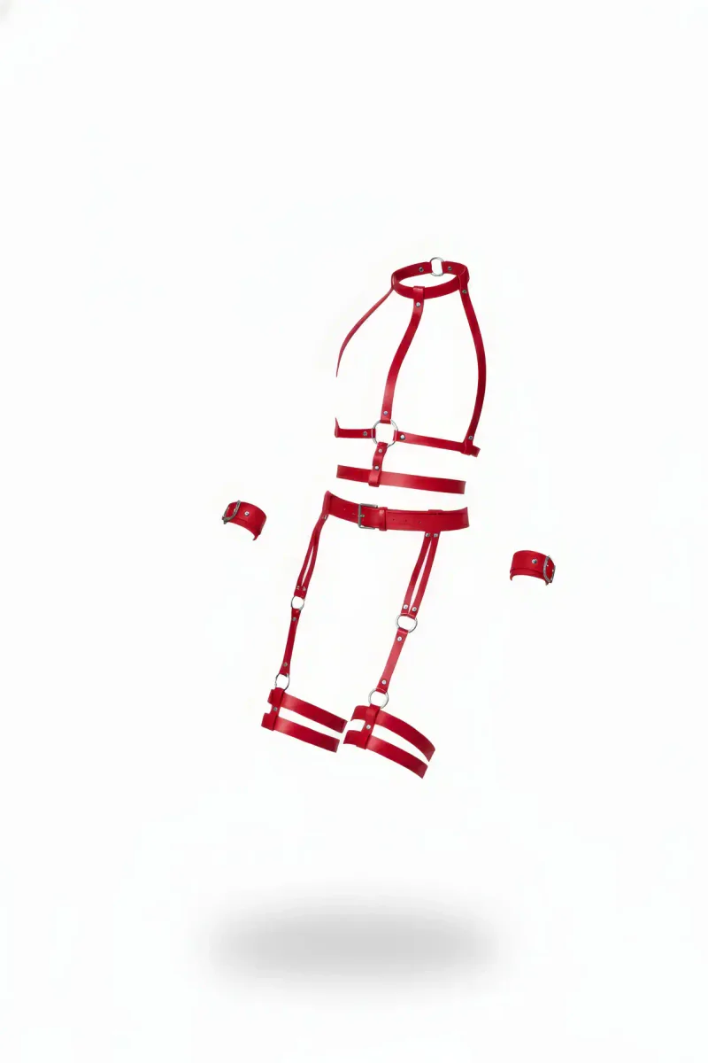 Red Garter Harness Leather Body Cage Bracelet Set - APFT697