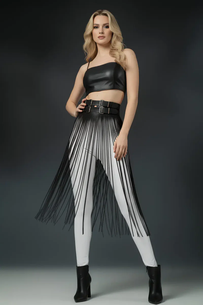 Long Fringe Skirt Faux Leather High Waist Belt Overlay