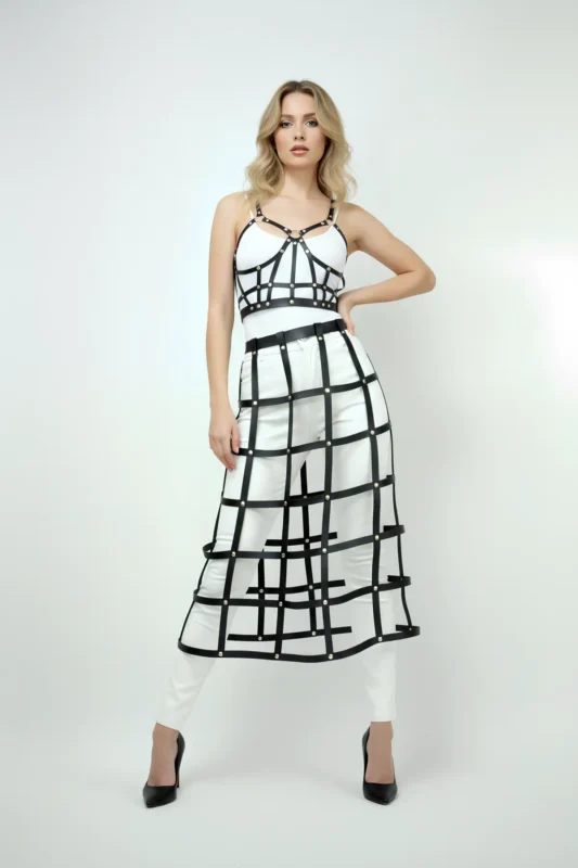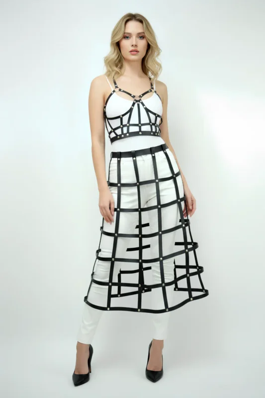 Black Faux Leather Cage Grid Body Harness & Maxi Skirt Set