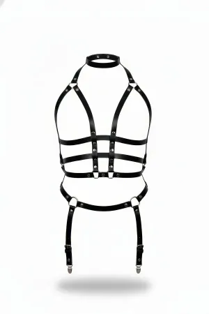 Black Harness Suit Leather High Collar with Garter - APFT707