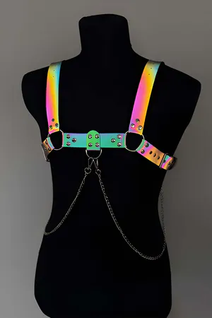 Stylish Men's Chest Harness with Rainbow Reflective (Glow in the Dark) Chain Detail, Reflective Clubwear - APFTM109Stylish Men's Chest Harness with Rainbow Reflective (Glow in the Dark) Chain Detail, Reflective Clubwear - APFTM109Stylish Men's Chest Harness with Rainbow Reflective (Glow in the Dark) Chain Detail, Reflective Clubwear - APFTM109