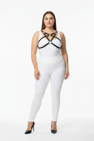 Plus Size Black Women's Leather Harness Suit Ring Detailed Body Accessory - APFT1302