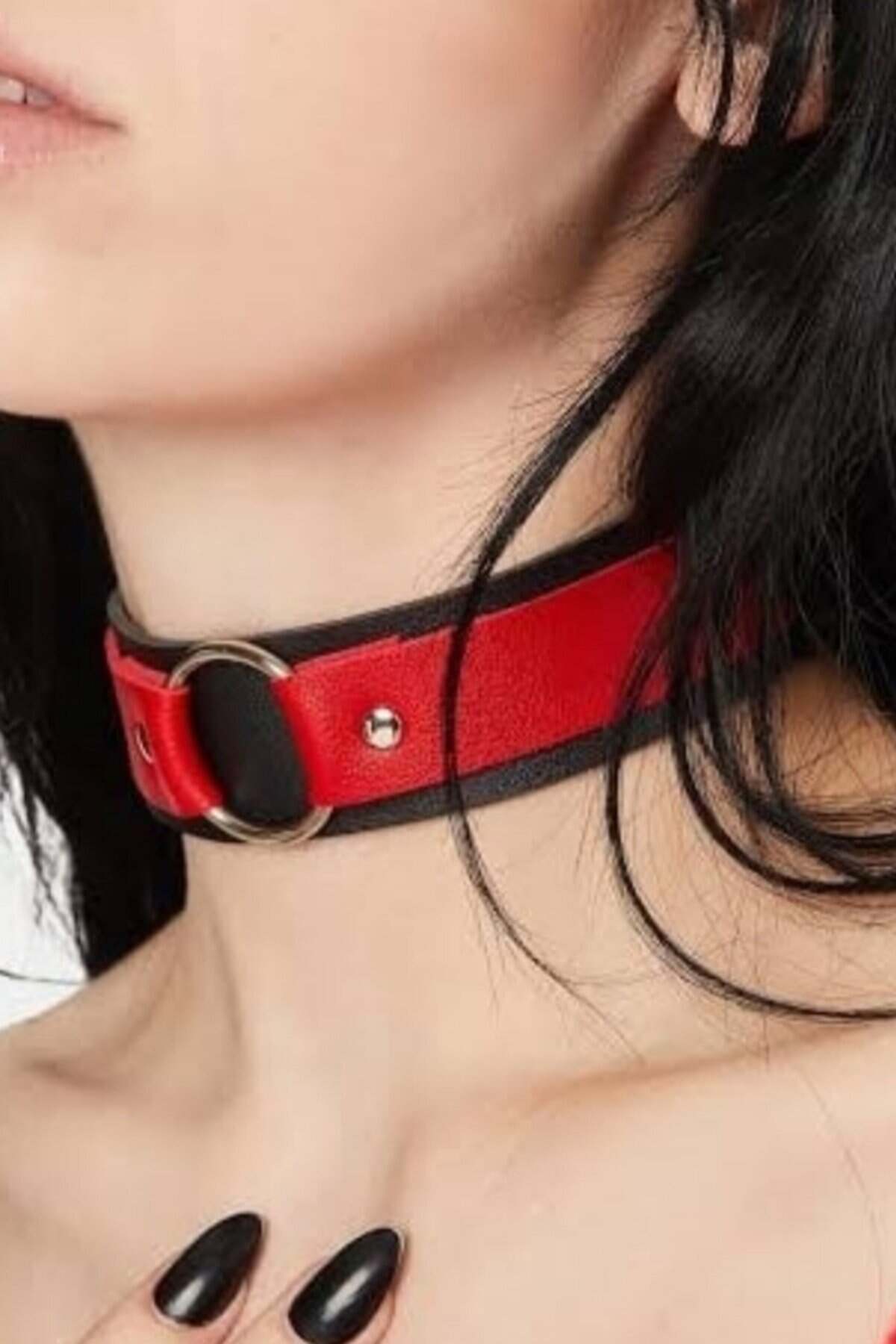 Leather Choker Adjustable Stylish Collar with Single Ring – Black & Red