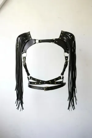 Black Chest Harness Shoulder Tassels Staple Detailed Leather - APFT999