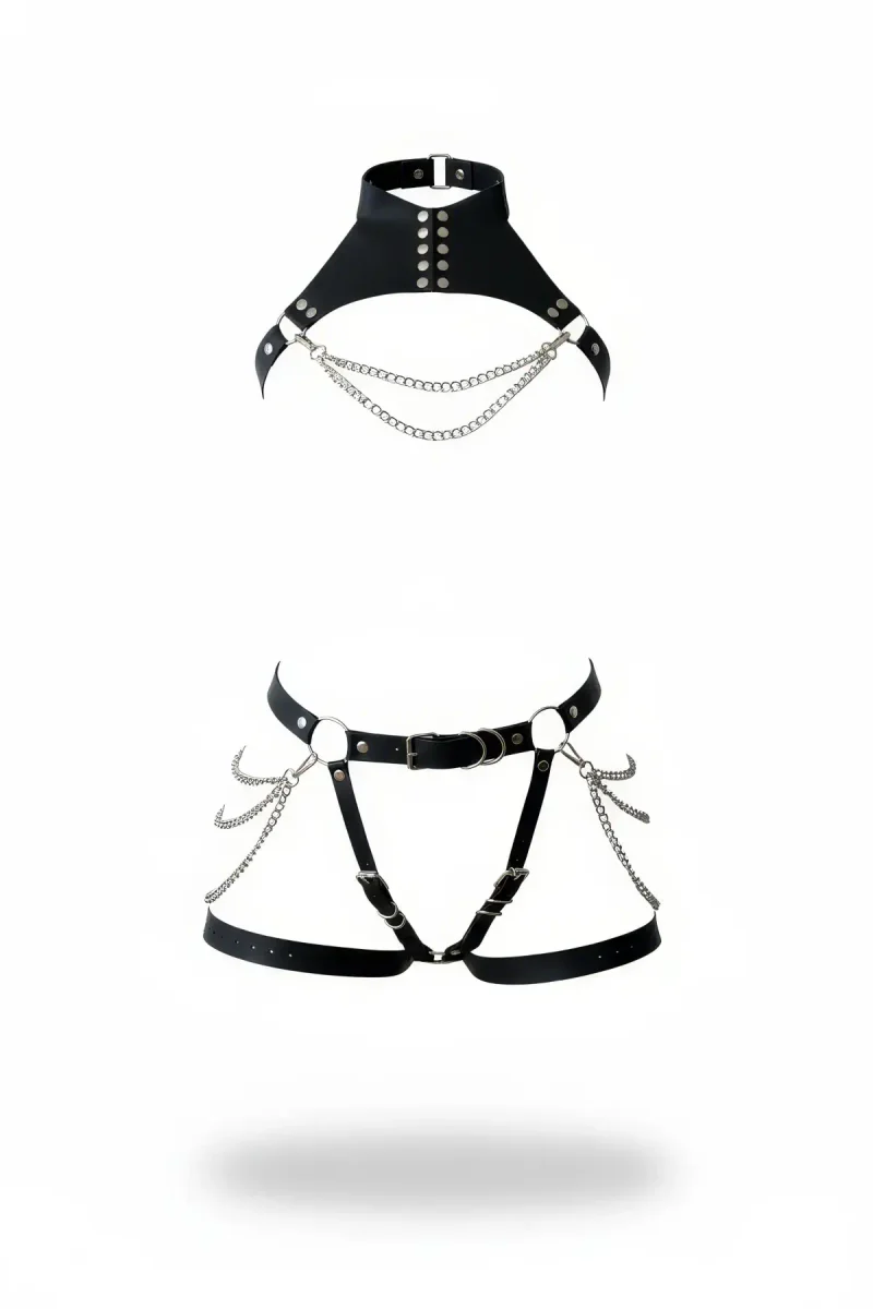 Home/Womens Harness/Garter Harness/Black Garter Harness Chain Detailed Leather Double Suit - APFT1369