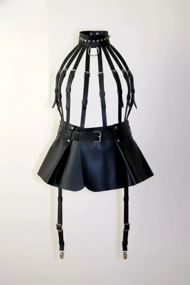 Black Faux Leather Cage Harness Top & Midi Skirt Set