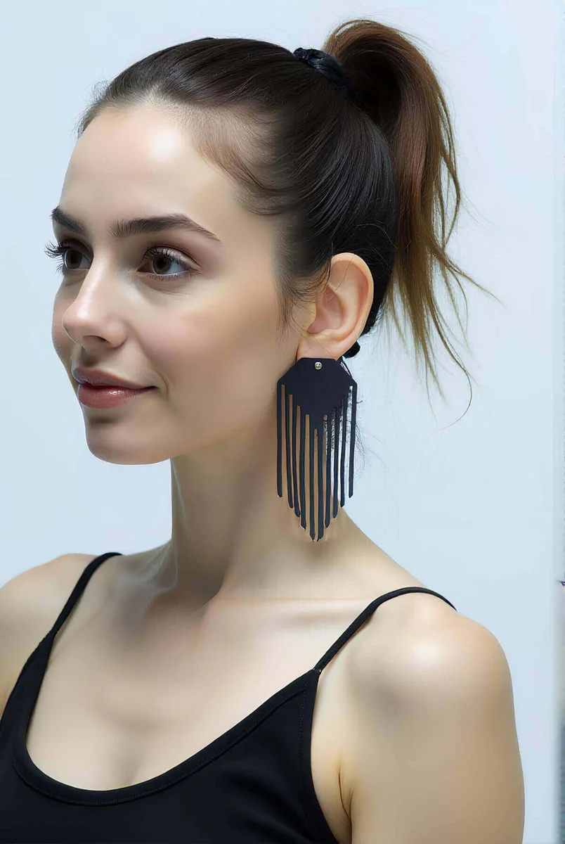 Black Tassel Earrings, Stylish Laser Cut Leather Earrings - APBJ016