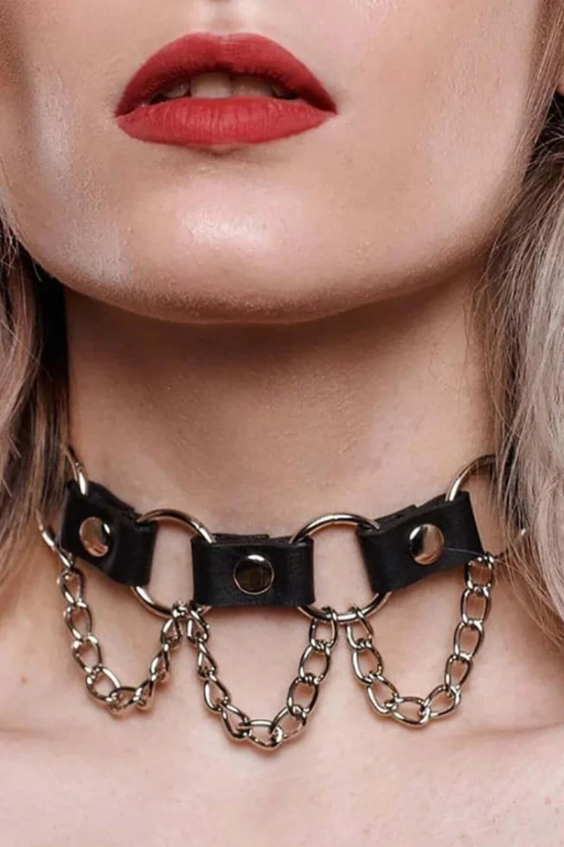 Chain and Ring Detailed Leather Choker Collar Neck Collar Accessory - APFT662