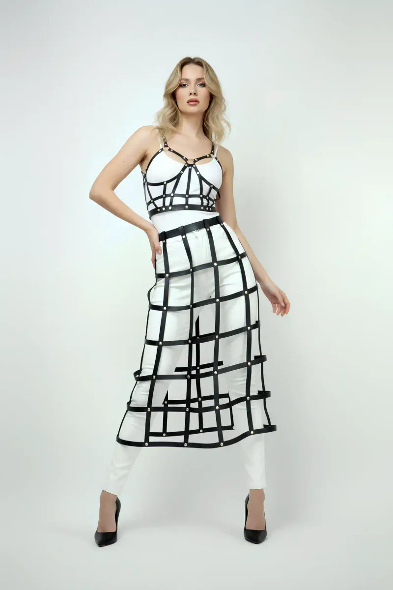 Crafted from high-quality, supple black vegan leather straps, this meticulously designed set features a striking grid-patterned midi skirt overlay and a complementary adjustable chest harness. The skirt offers a unique layering piece over pants or a dress, while the harness top provides contour. Available in a range of sizes to ensure a perfect fit, it's ideal for making a bold fashion statement at parties, concerts, or avant-garde events. Experience unparalleled style and confidence. Shop this exclusive design now and redefine your look.