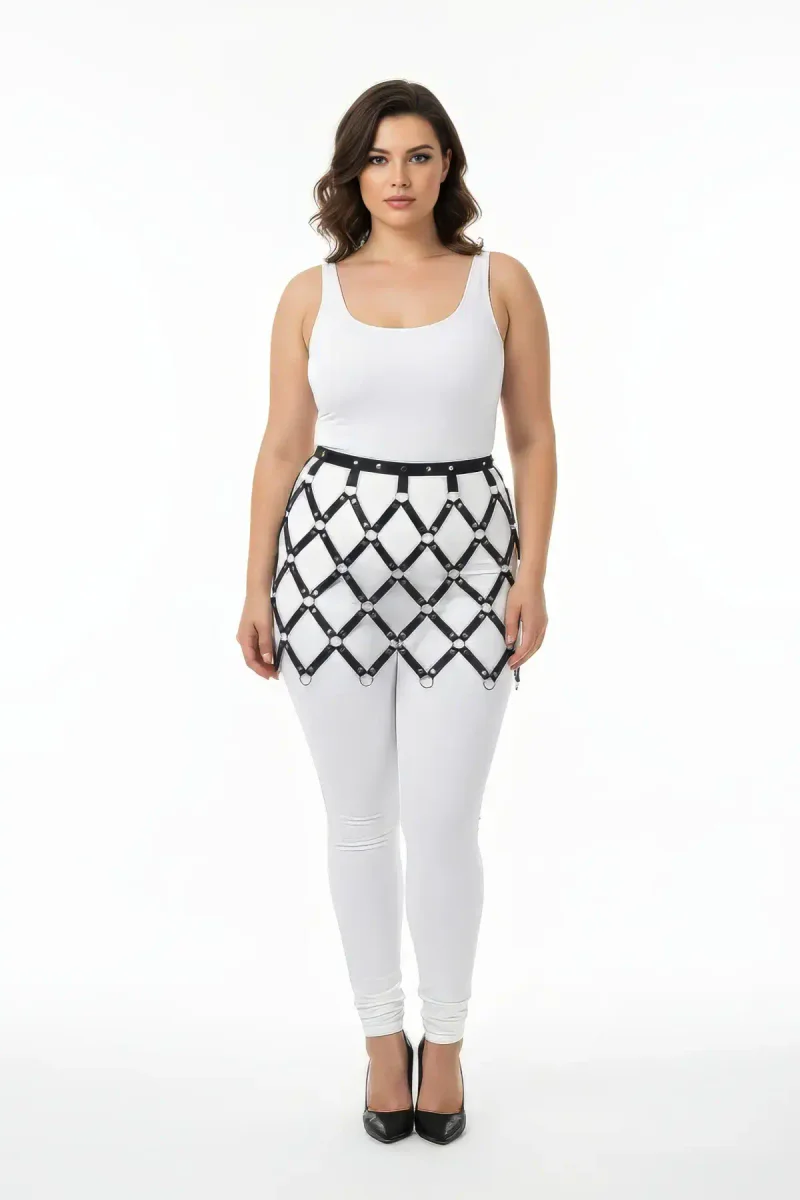 Plus Size Black Leather Skirt Ring Detailed Mesh Patterned Harness Accessory - APFT696