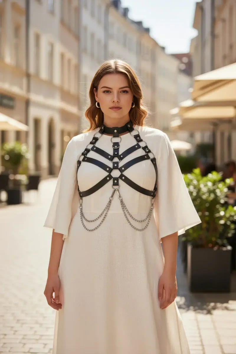 Plus Size Black Women's Belt Chain Detailed Leather Harness Body Accessory - APFT517