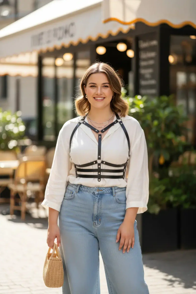Plus Size Black Women's Belt Leather Body Harness with Staple Detail - APFT543