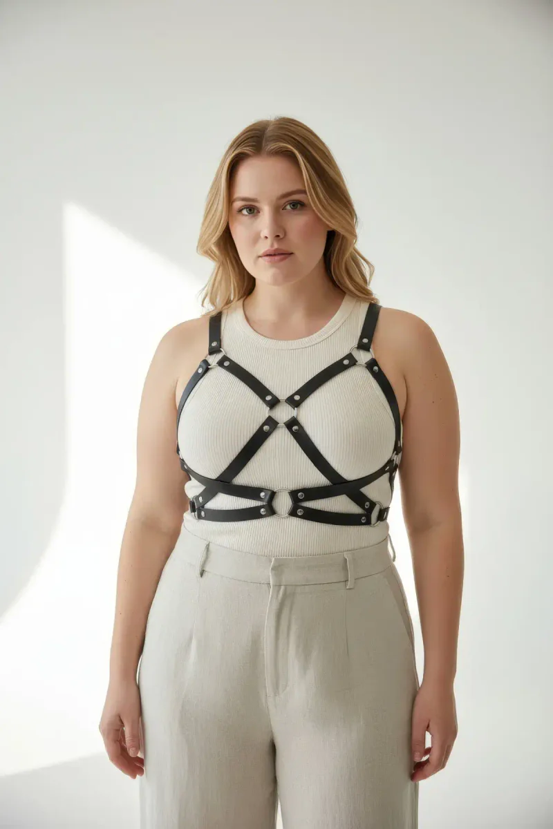 Home/Womens Belt/Plus Size Black Women's Belt & Ring Detailed Leather Harness Body Accessory - APFT816