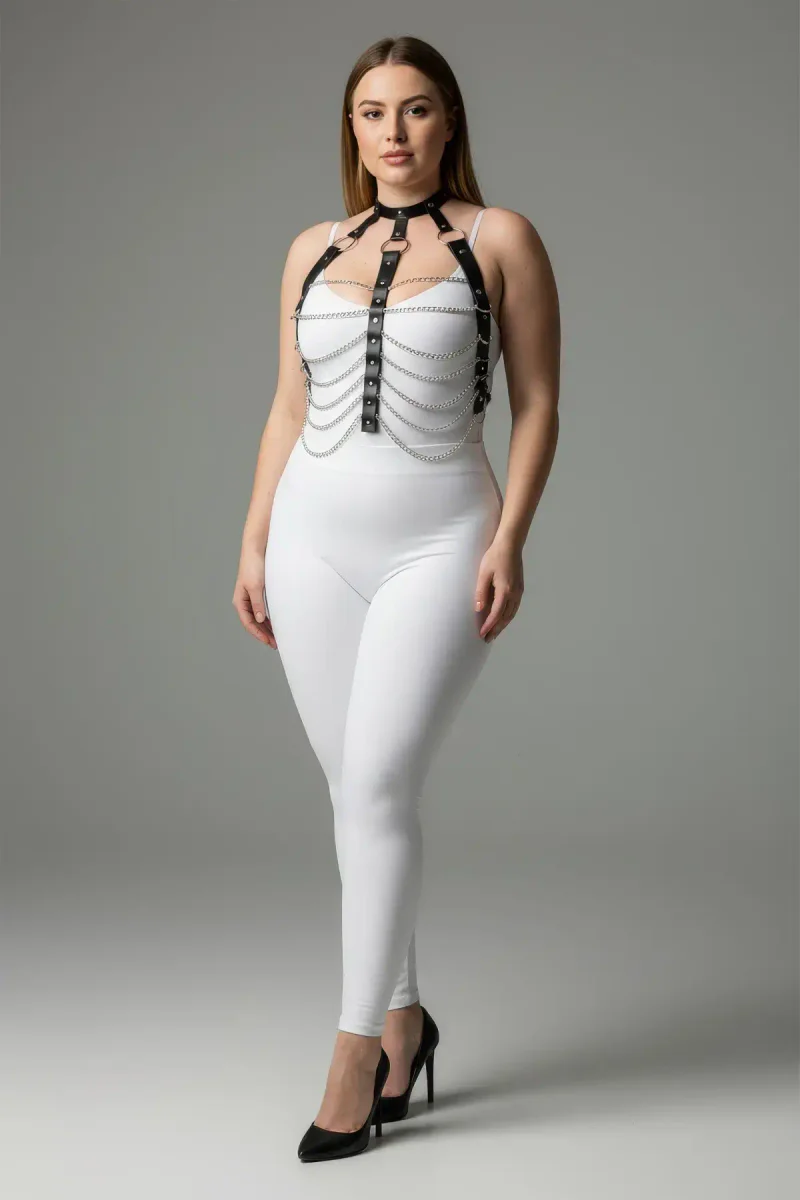 Plus Size Black Women's Chain Detailed Leather Harness Suit Fancy Accessory - APFT304