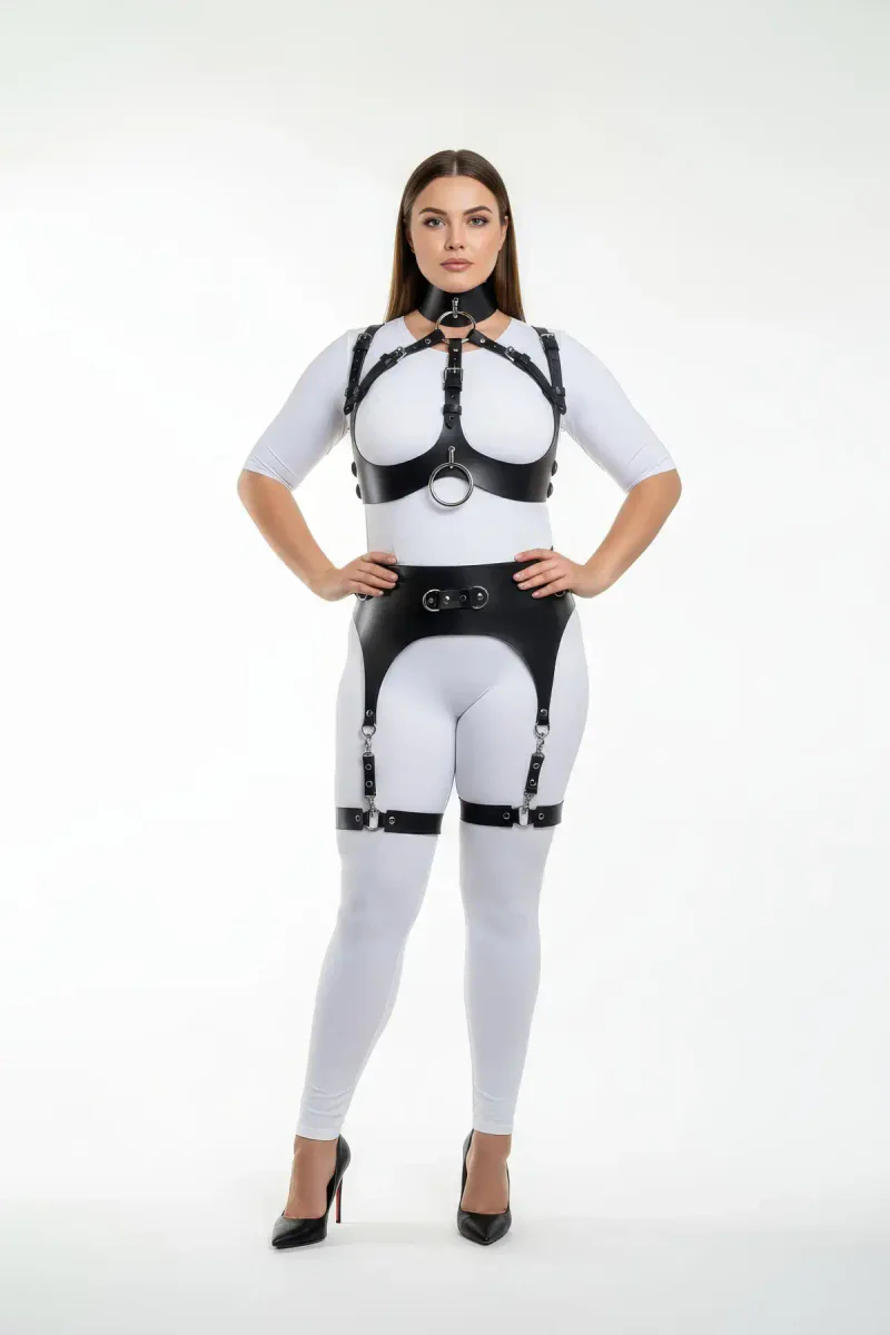 Home/Womens Harness/Harness Set/Plus Size Black Women's Full Body Leather Harness Suit with Garter Detail Special Design - APFT1231