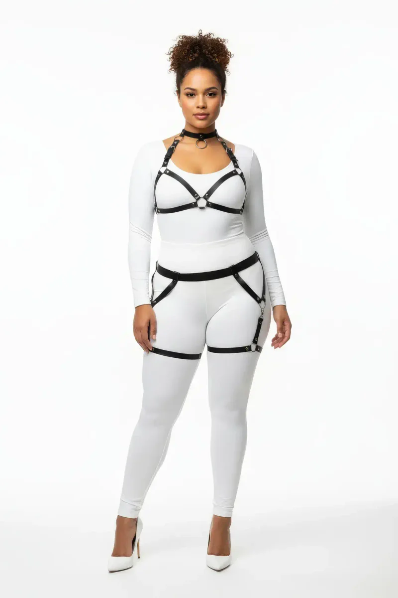 Plus Size Black Women's Leather Harness Set with Garter Ring Detail - APFT478