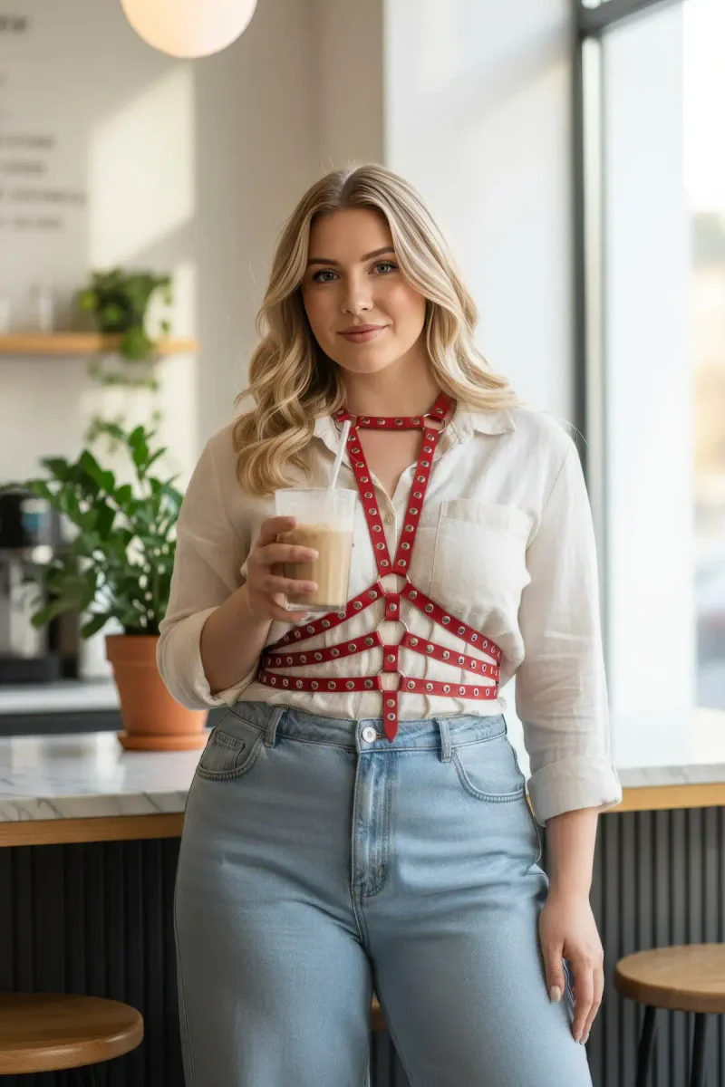 Plus Size Red Women's Belt Harness Style Leather Body Accessory with Metal Detail - APFT546