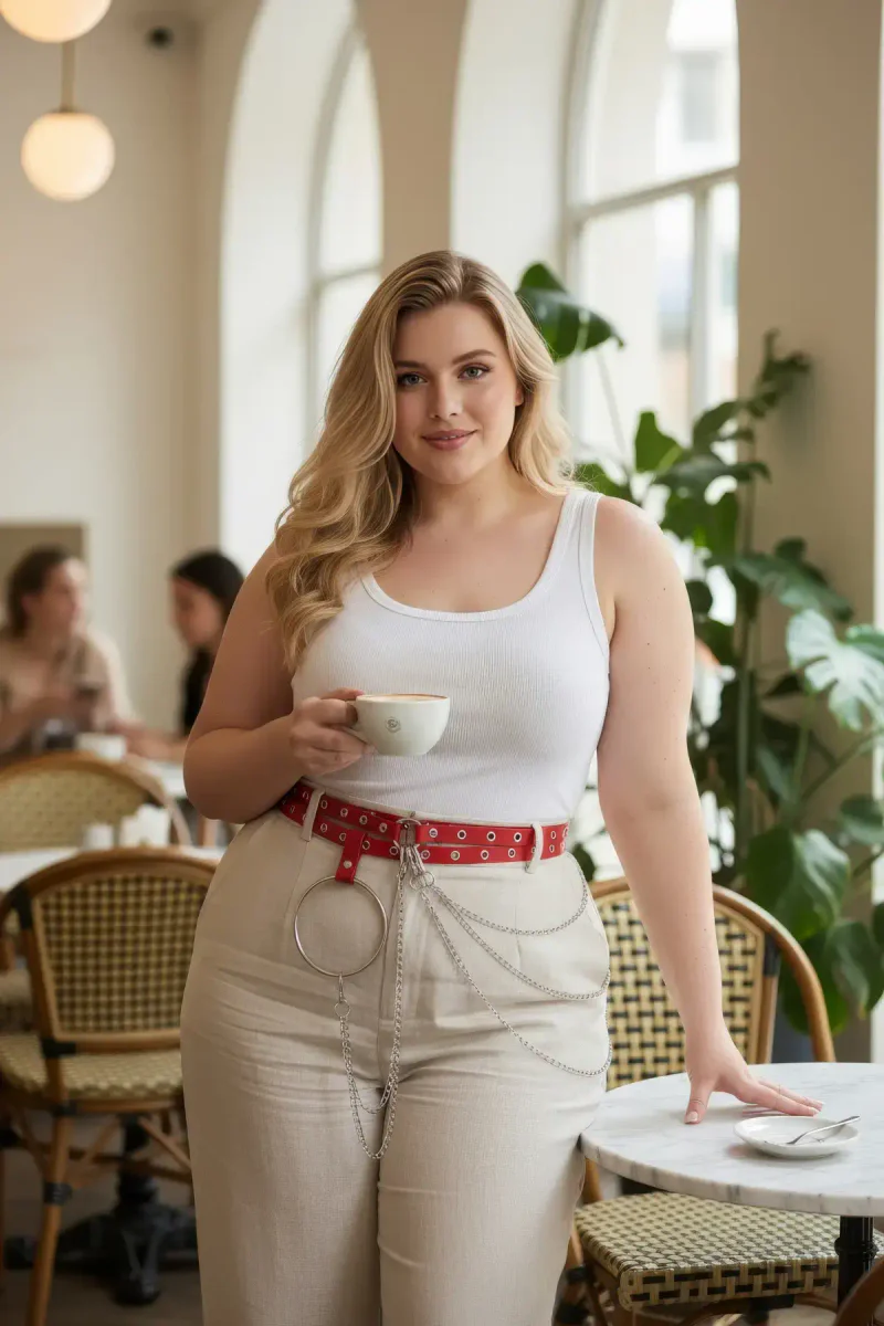 Plus Size Red Women's Belt with Chain and Ring Detail, Leather Look - APFT731