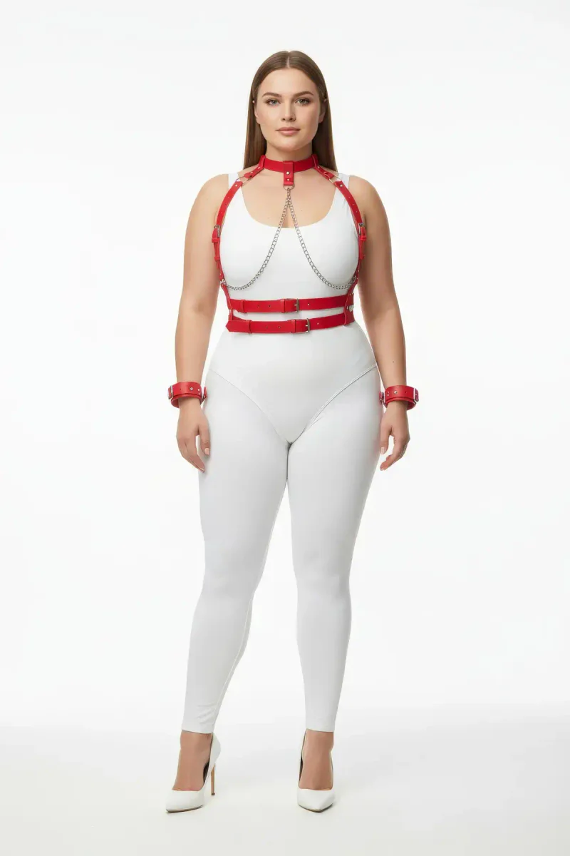 Plus Size Red Women's Leather Harness Suit Chain Detailed Fancy Accessory - APFT720