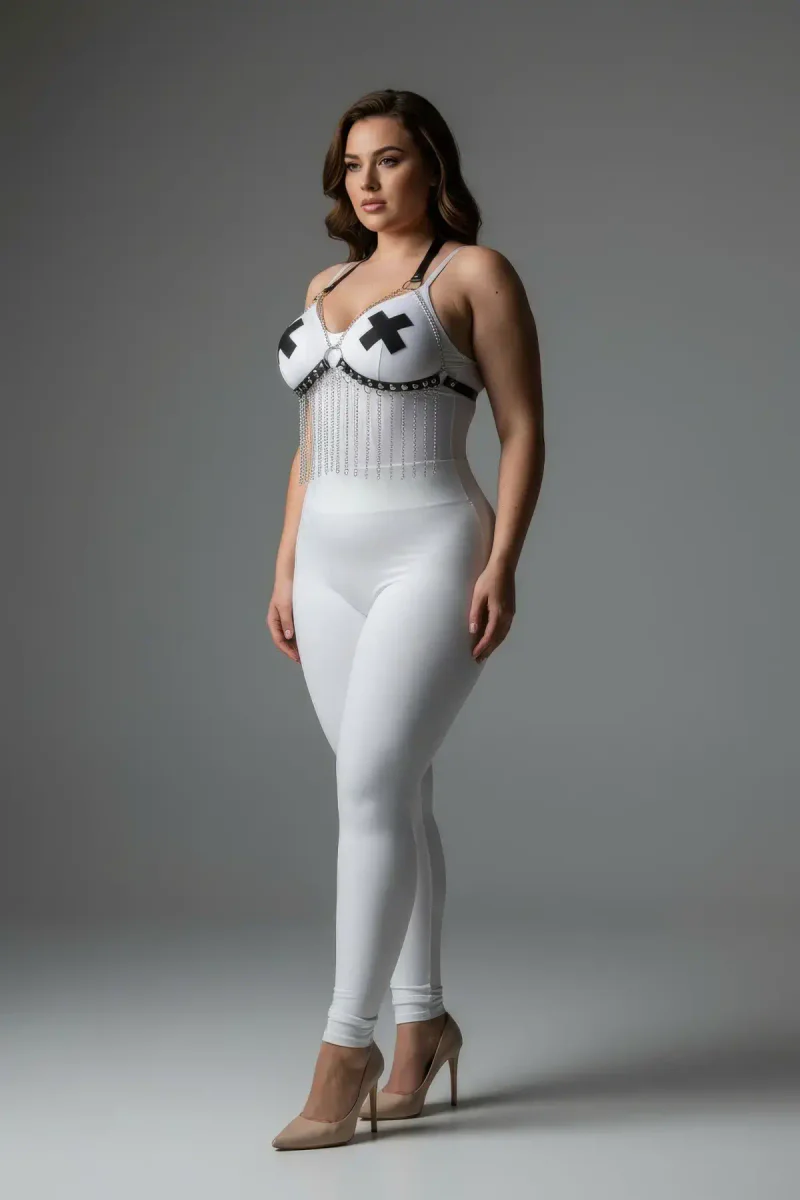 Plus Size White Women's Harness Suit Chain Detailed Leather Fancy Accessory - APFT477