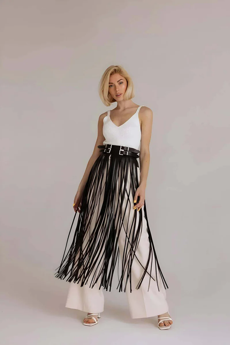 Searching for a distinctive fringe skirt belt for women? Elevate your fashion game instantly with our premium faux leather tassel waist skirt, designed to make a bold statement. This unique accessory combines the allure of a skirt with the versatility of a belt, promising an unforgettable, head-turning silhouette for any occasion. Don't just dress, express your daring style.