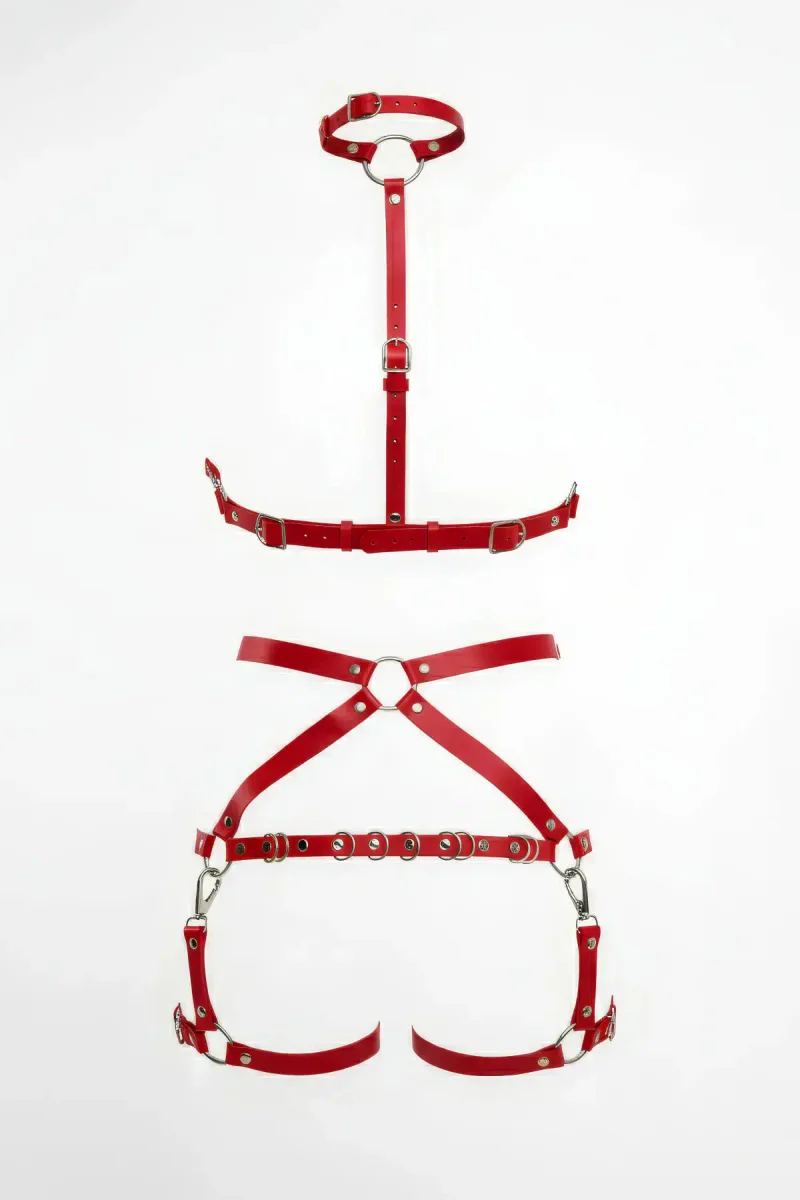 Red Harness Set Adjustable Body Accessory with Leather O Ring Detail - APFT874