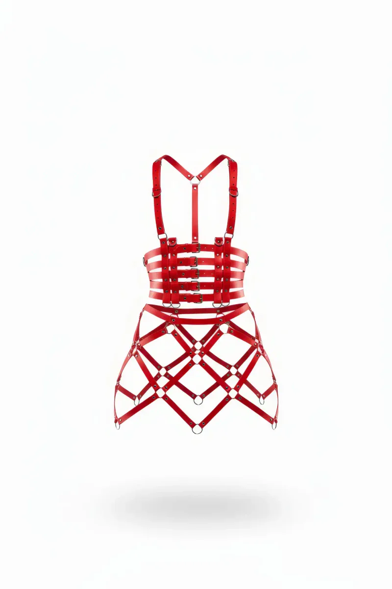 Red Skirt Leather Bustier Top with Hoop Detail - APFT785
