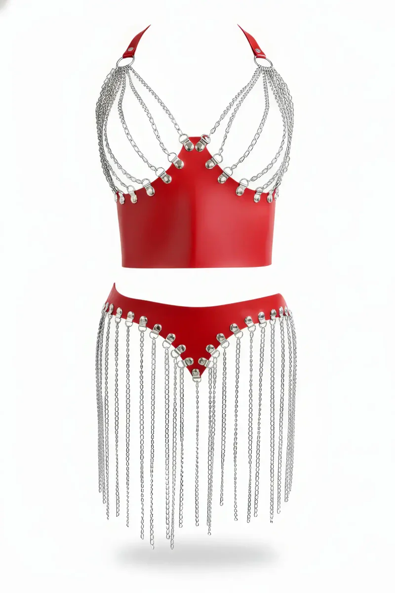 Red Skirt Shiny Leather Chain Fringed Mini Skirt - APFT994