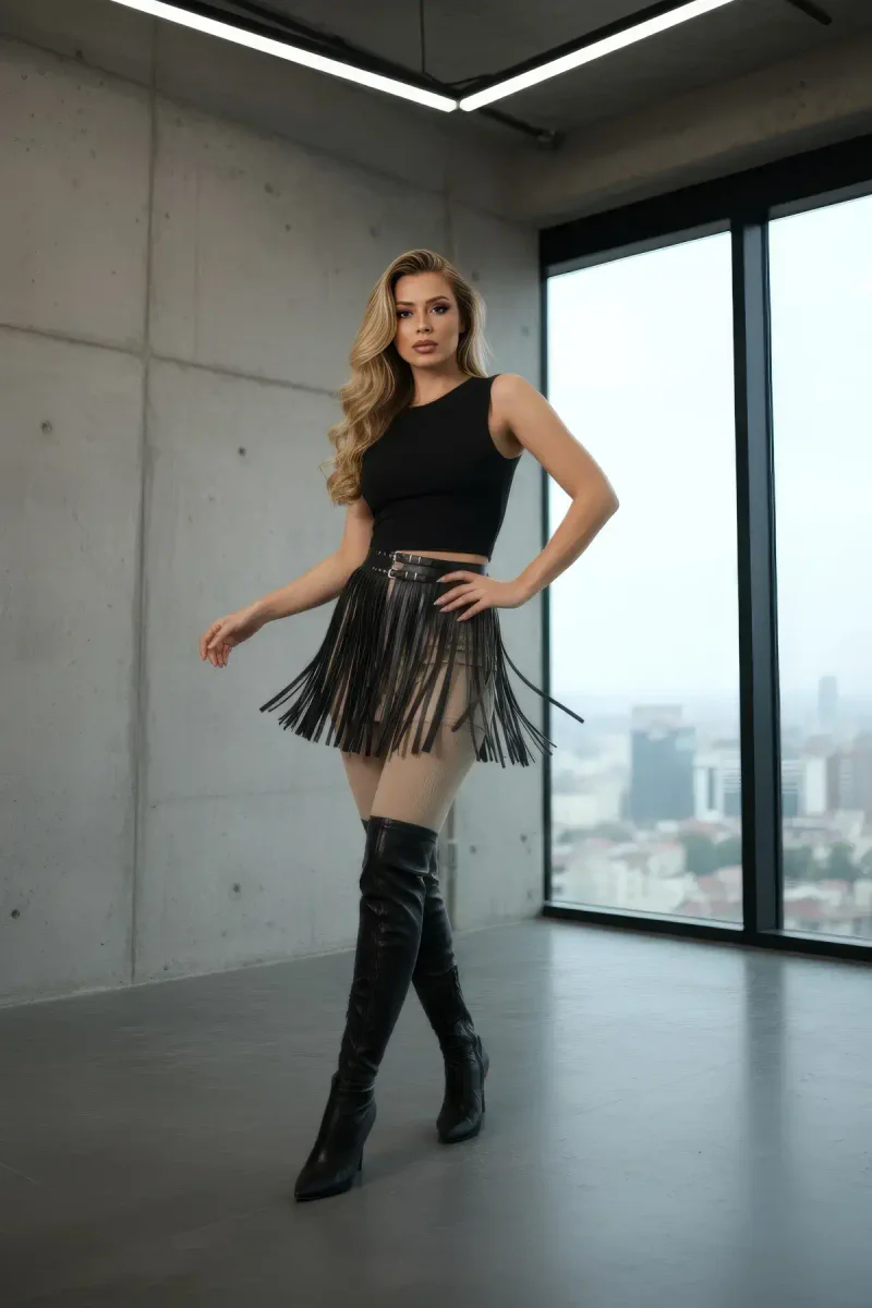Looking for a show-stopping black fringe mini skirt? Discover the ultimate statement piece designed to turn heads and ignite your confidence. Our faux leather tasseled skirt is crafted for those who demand unique style and a powerful presence, perfect for your next night out or special event. Achieve a high-fashion look that truly stands out from the crowd.